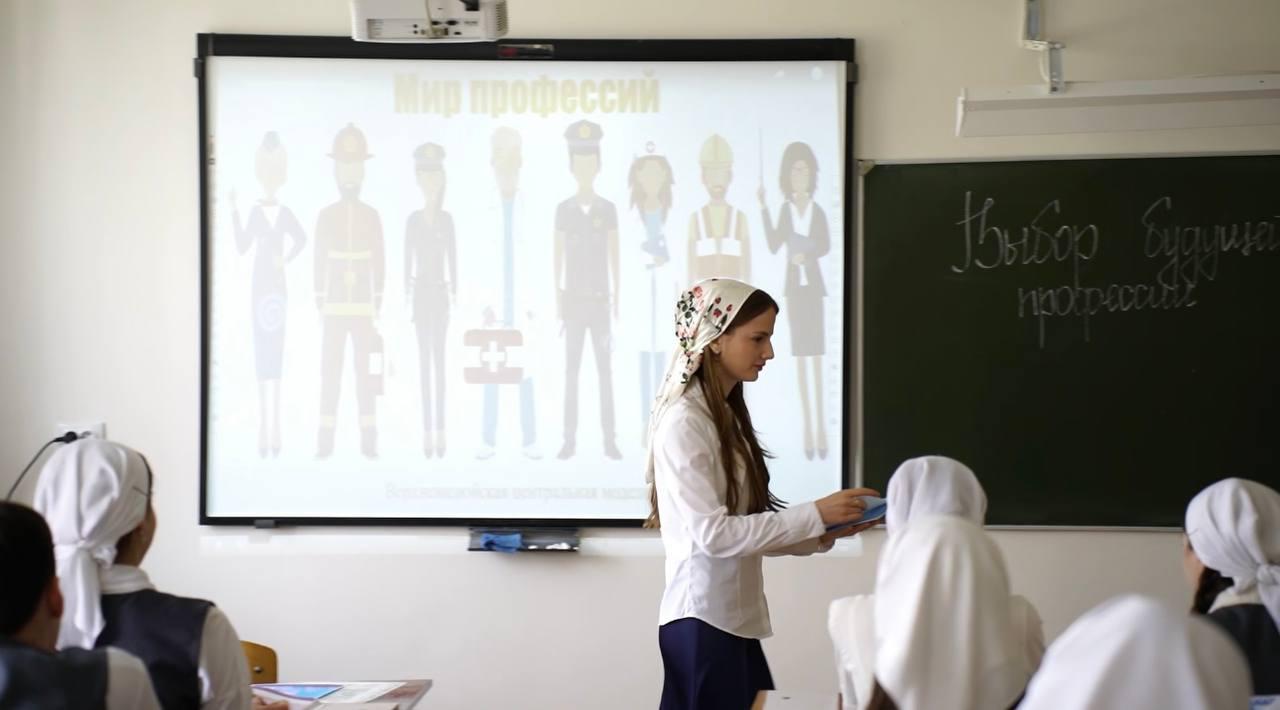 На уроке профориентации дети были ознакомлены с востребованными на сегодняшний день профессиями. Шовда Асланбековна рассказала о том, как важно знать специальности, как правильно выбрать специальность учитывая личные интересы. Для более глубокого проникновения в мир профессий был показан информационный ролик «Все профессии нужны».